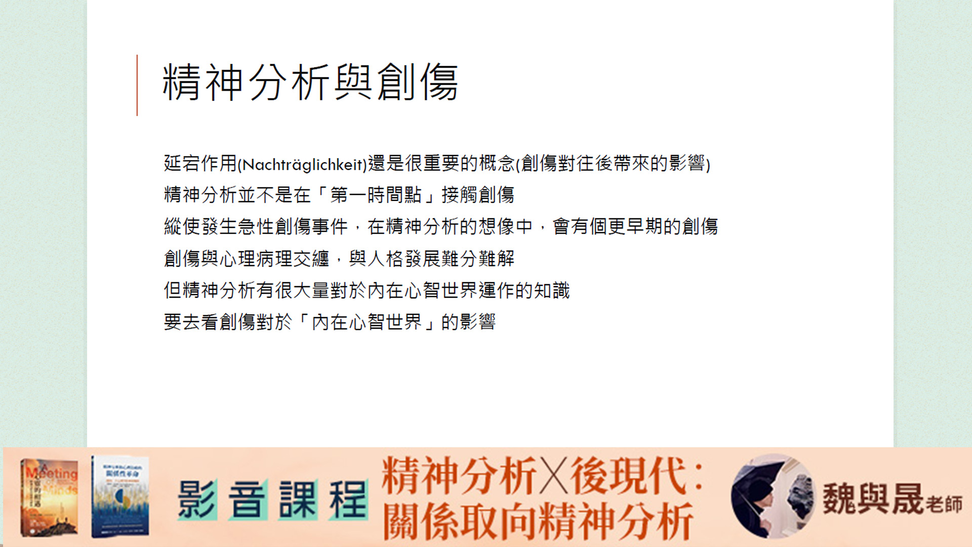 魏與晟【精神分析x後現代:關係取向精神分析】四講影音課程:https://psygarden.havppen.com/course/Tf1pyRQCR0om