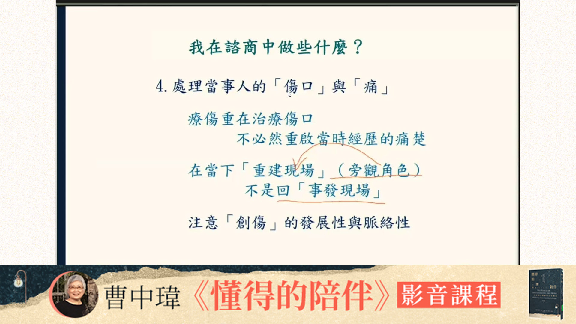 曹中瑋《懂得的陪伴》深度導讀五堂講座 影音課程:https://psygarden.havppen.com/course/5AVtYsxgiiey