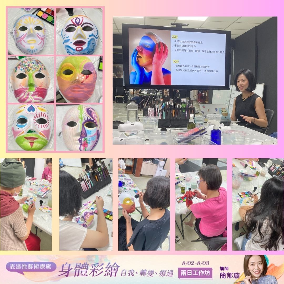 🎭 上午課程郁璇老師由身體彩繪的創作背景、概念跟她如何與助人工作的結合等專業背景的講述開始,在媒材介紹之後,就讓大家開始進行平面創作——用色彩在白色面具上,描繪自己的內在風景。