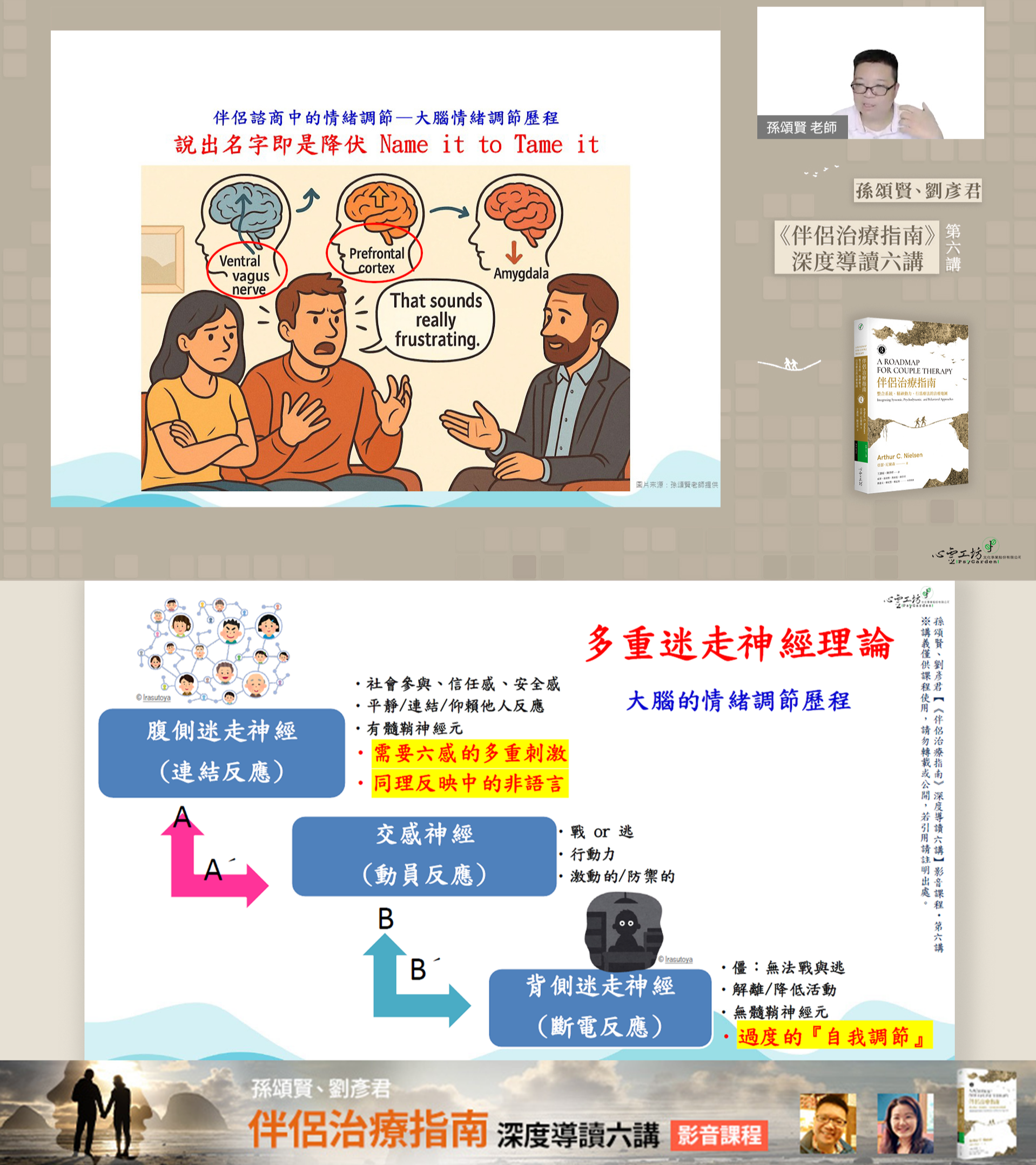 這堂課反覆強調的關鍵技巧是:「Name it to tame it」(說出名字即是降伏)。乍聽簡單,老師以蘊含神經科學與依附理論的深厚底蘊來說明。當我們能把混亂的感受轉化成語言,情緒腦便會讓位給前額葉,進一步促進調節與連結。不論是認知行為、EFT情緒聚焦、敘事治療還是IFS內在家庭系統,這個技巧都是跨學派可運用的橋樑。頌賢老師透過多重迷走神經理論具體說明,當治療師透過命名、放慢、同理:「我聽到的不是生氣,而是抗議的痛苦與受傷。」就讓情緒有了被涵納的空間,也讓治療室回歸安全。