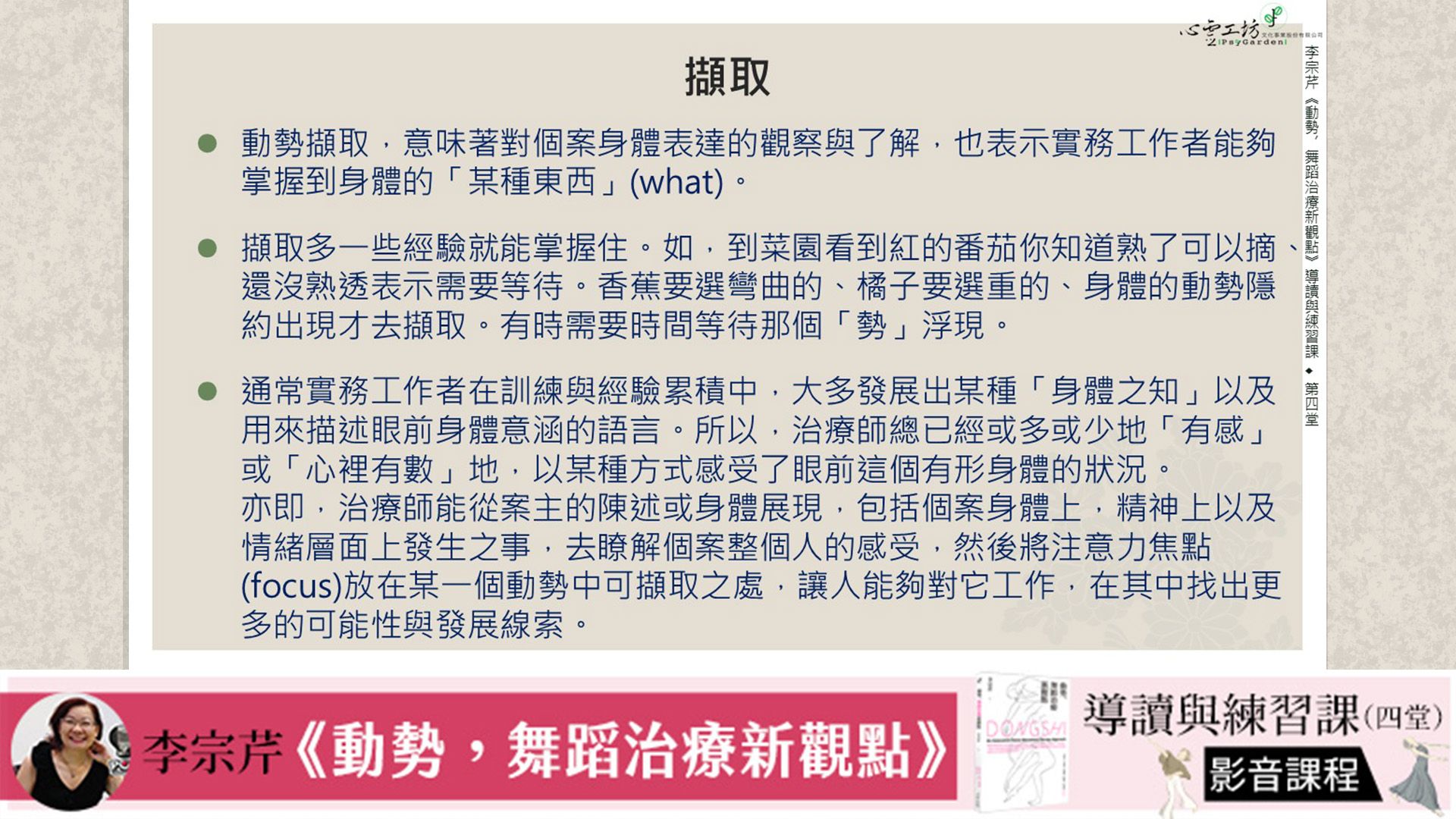 李宗芹《動勢,舞蹈治療新觀點》導讀與練習課四堂 影音課程:https://psygarden.havppen.com/course/dongshi