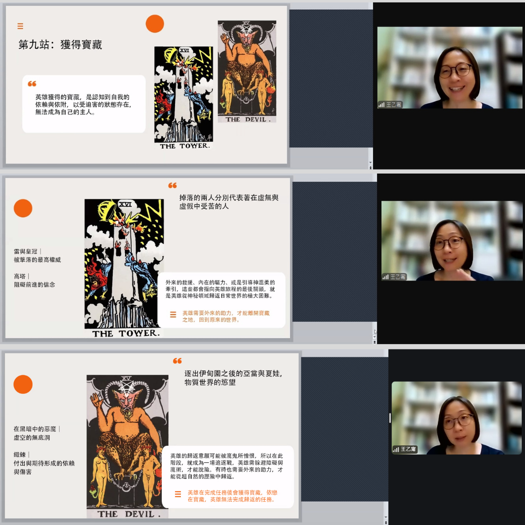 這堂的問答時間回想起來,還真像抽到高塔牌,得將過去所學的塔羅抽牌占卜方式打掉重來,用坎伯的英雄旅程來看每個階段的意義。不過再仔細想想,與其說是打掉重來,我覺得可能更像是融會貫通。